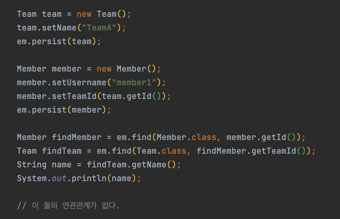 위 코드처럼 Member와 Team의 연관관계가 없기 때문에 객체의 협력으로 값을 가져오는 것이 아닌 id을 가져오고 그 팀의 이름을 꺼내오는 듯이 억지로 값을 가져와야 한다.