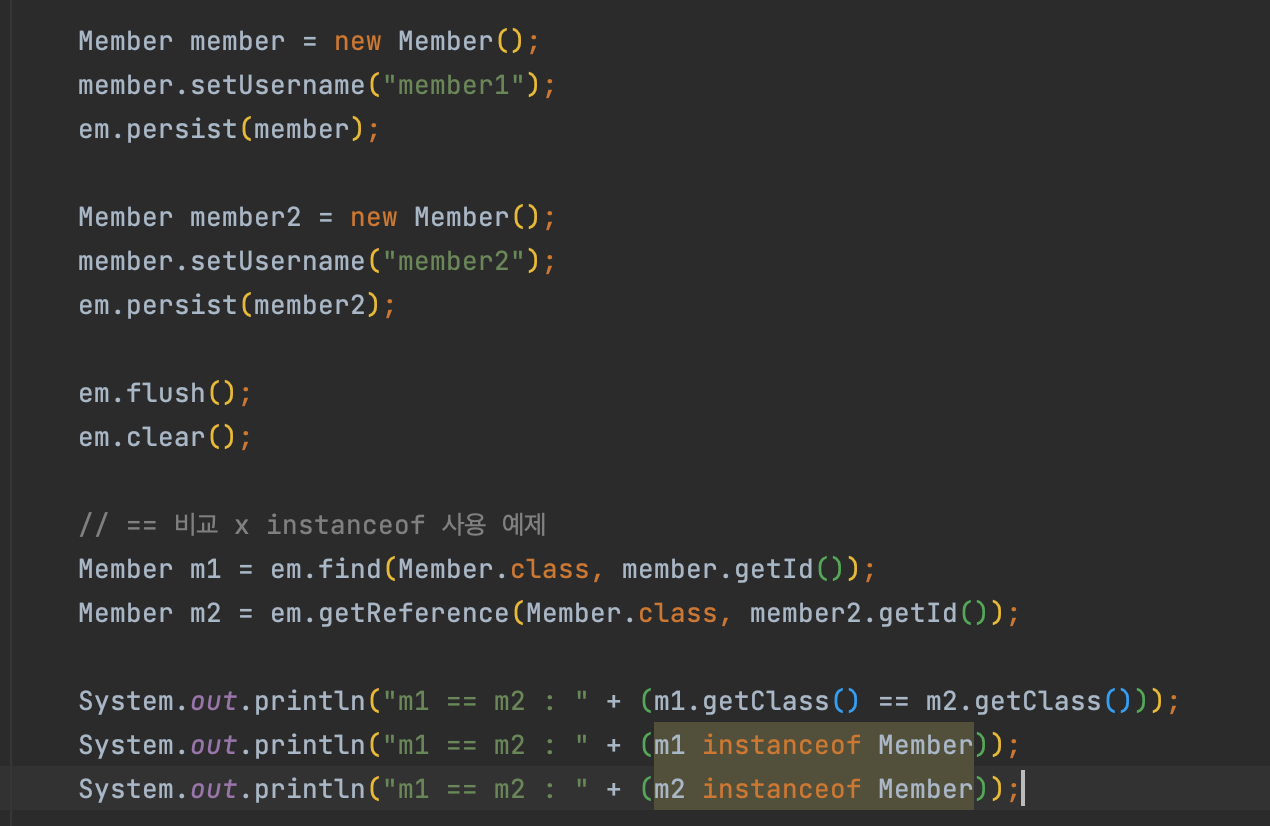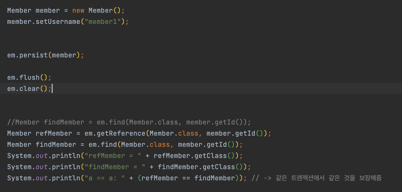 위처럼 findMember를 가져온이후에 프록시로 같은 엔티티를 참조할 경우 프록시가 가져오는 것이 아닌 엔티티가 가져와진다. 이러한 이유는 JPA는 같은 트랜젝션에서 같은 것을 보장을 해주기 때문이다.