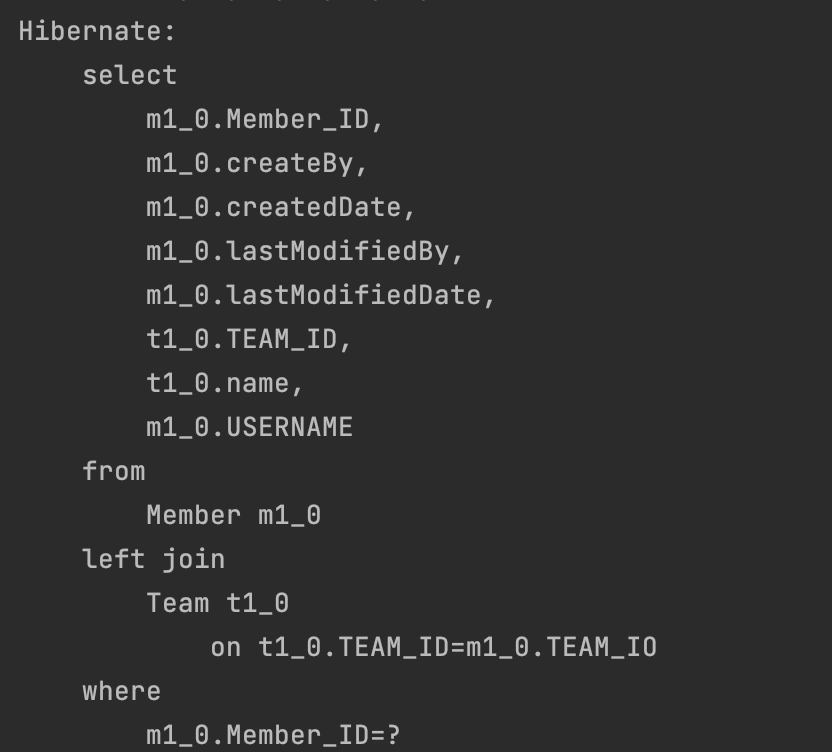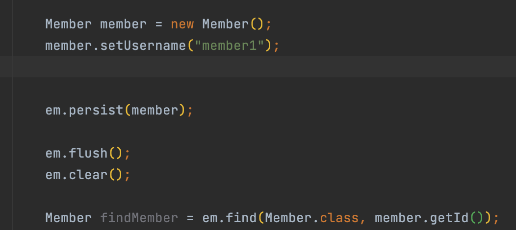 em.find를 통해서 객체를 찾으려고 하면 영속성 컨텍스트에 아무것도 존재하지 않을 때, 당연히 select 쿼리가 나가는 것을 볼 수 있다. em.find를 하면 디비에 해당 엔티티를 가져오기 때문이다.