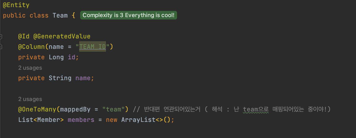 위처럼 Fk가 없는 엔티티에 mappedBy를 이용해서 Team 테이블이 Member 테이블과 연관관계가 있다는 것을 알려준다.