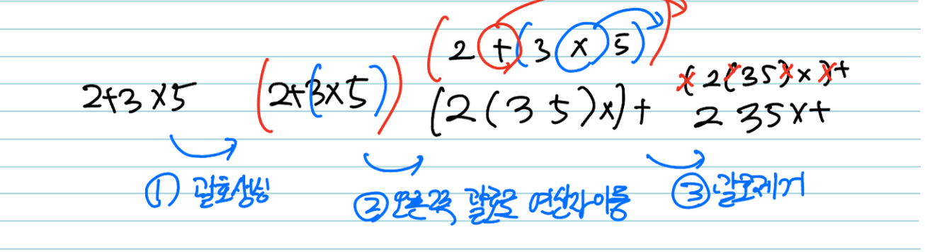 - 중위표기법(infix) : 연산자가 안에 있어서 infix라고 부릅니다. ex) 2 + 3 * 5