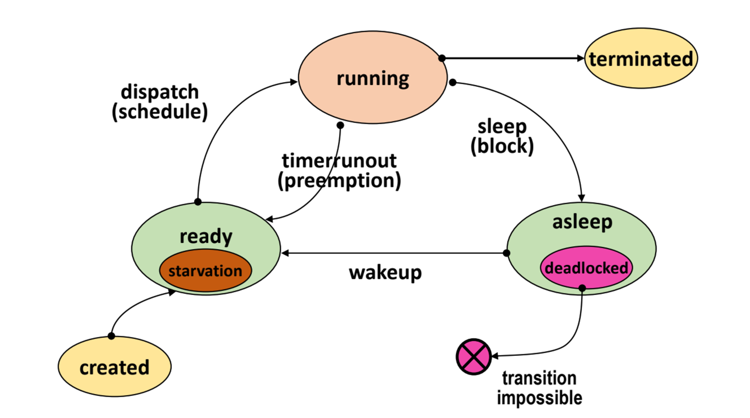 Deadlock은 프로세스가 발생 가능성이 없는 이벤트를 기다리는 경우를 말한다. 즉 필요한 자원을 기다리는 상태를 의미하는데 이는 Blocked/Asleep state에서 절대 받을 수 없는 자원을 기다리는 것을 의미한다.