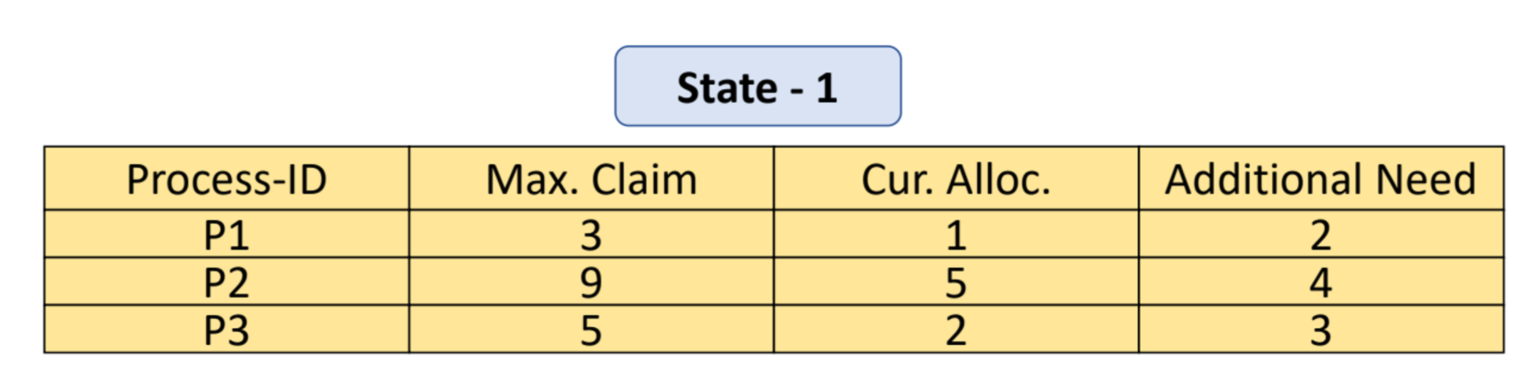이때 무조건적으로 Deadlock이 발생하지 않는 이유는 위 표의 Additional Need는 최대 필요한 자원의 개수이다. 즉, P1이 자원이 4개가 안필요했을 수도 있어서, P1이 정상적으로 종료될 수도 있기 때문이다.
