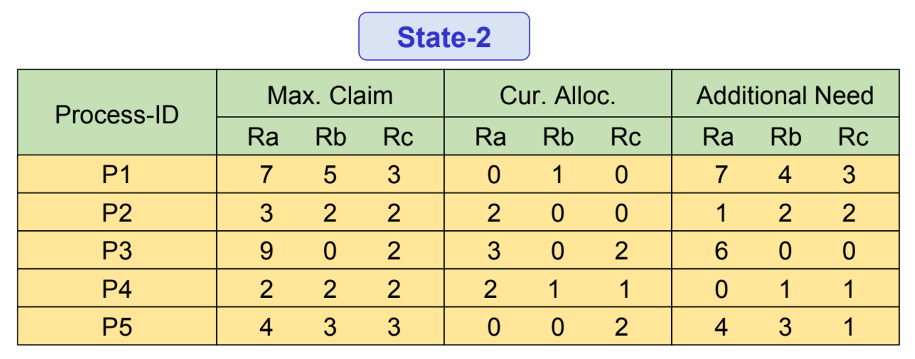 5개 프로세스가 존재하고 Ra, Rb, Rc 4가지 자원이 존재한다. 총자원의 개수는 순서대로 10,5,7이다.