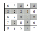 이제 위와 같은 지역에 많은 비가 내려서 높이가 4 이하인 모든 지점이 물에 잠겼다고 하자. 이 경우에 물에 잠기는 지점을 회색으로 표시하면 다음과 같다.